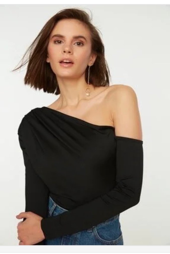 Kadınlar için drapeli, asimetrik kayık yaka, uzun kollu, bol ve kısa kesim bluz. İpeksi kumaştan yapılmış, koyu ve minimalist tarzda günlük kullanım için uygun.