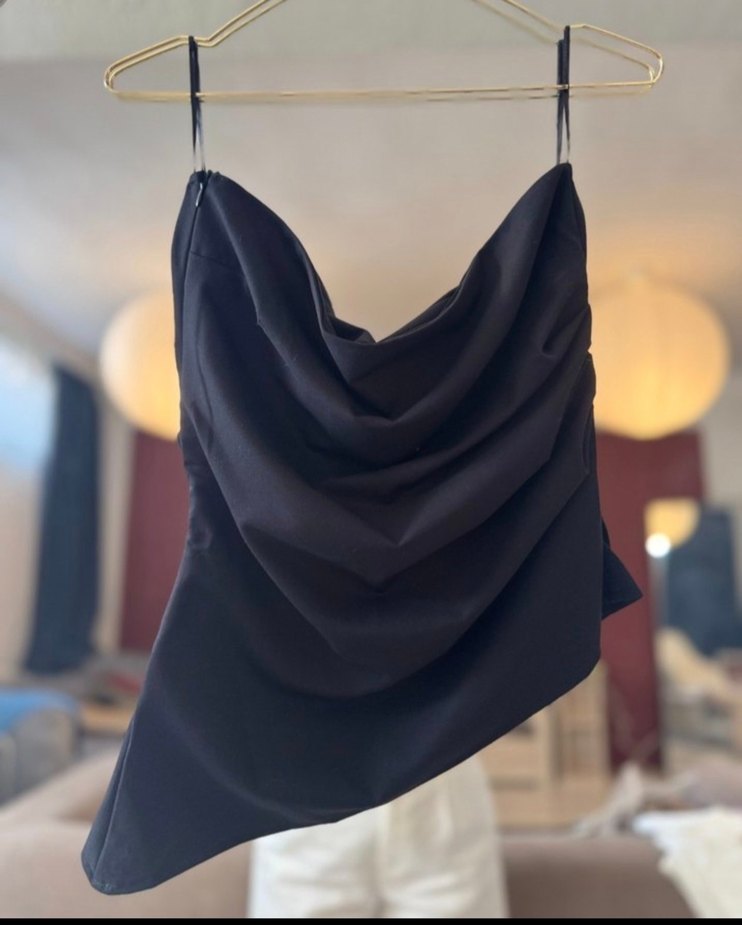 Siyah, askısız ve kolsuz bu bluz, drapeli yakası ve vücuda oturan kesimiyle romantik akşamlar için uygundur. ✨