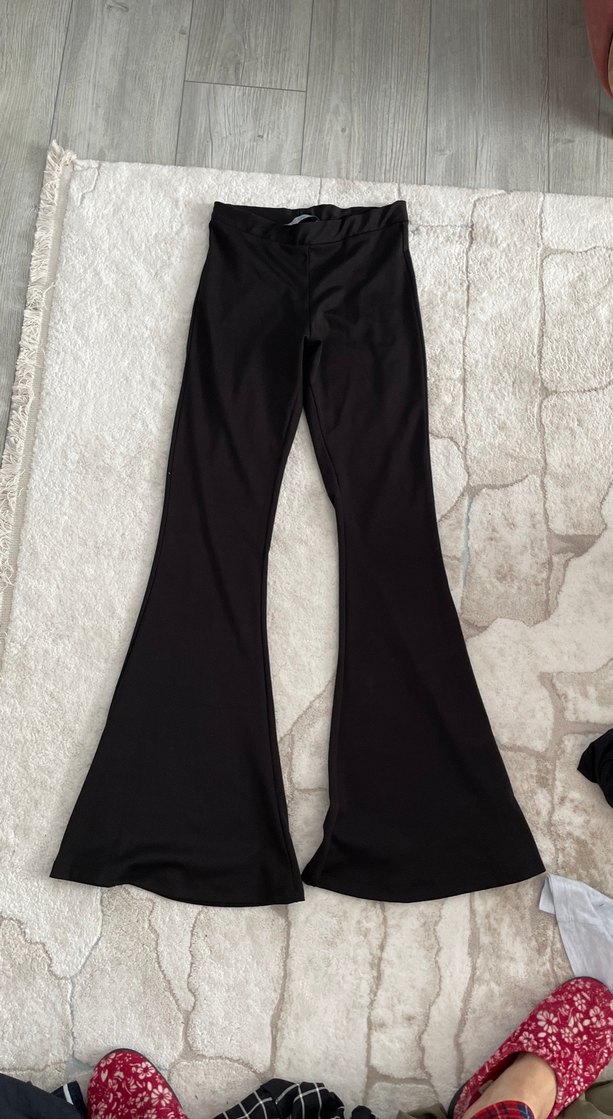 Kadınlar için siyah, drapeli ve geniş paçalı, yumuşak sentetik kumaştan yapılmış dar kesim pantolon. Günlük rahat kullanıma uygun, trend goth tarzında.