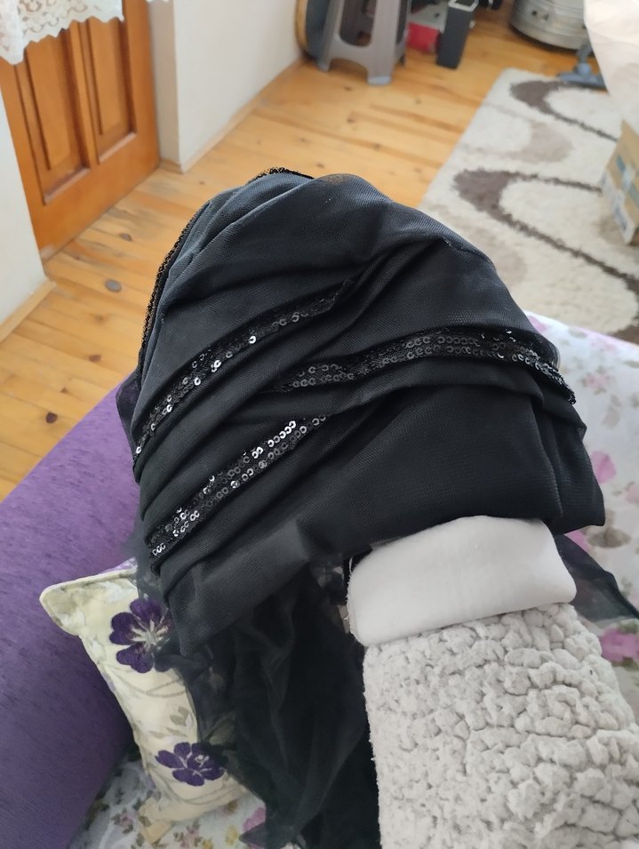 Kadın siyah şal, drapeli tasarım ve şık payet detaylarıyla yumuşak sentetik kumaştan üretilmiştir. Gotik ve avant-garde tarzlara uygundur. hazır duvak eşarp modeli