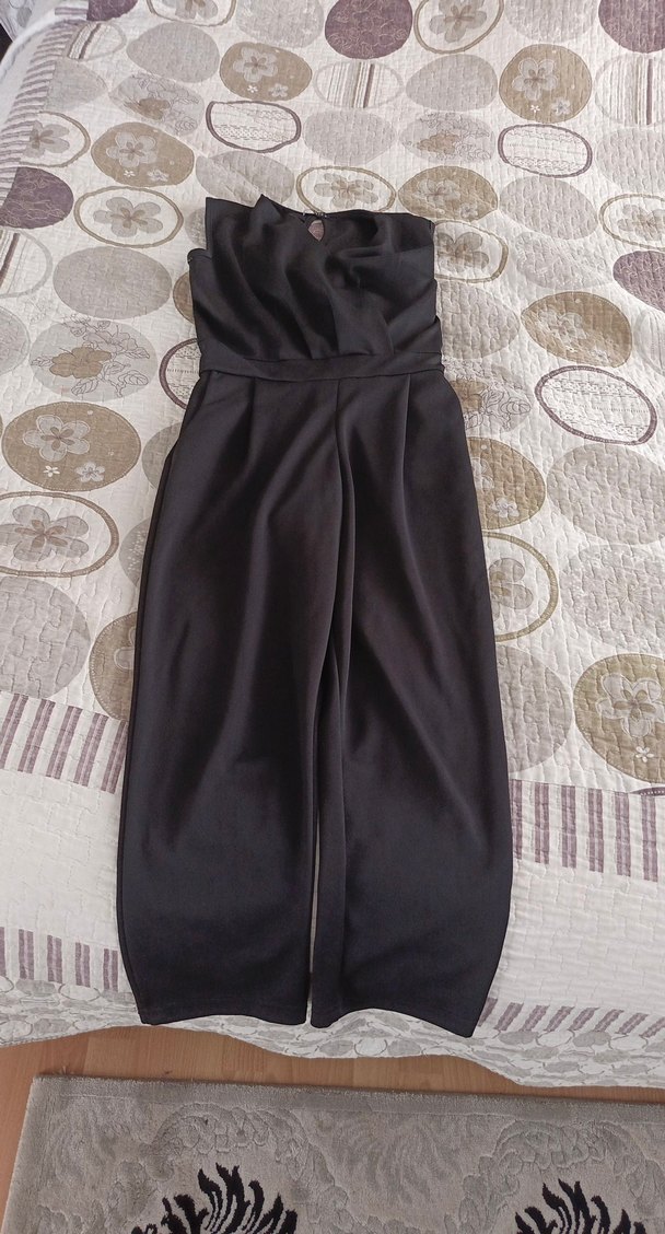 Kadın siyah tulum, straplez yaka ve drapeli detaylara sahiptir. Uzun boy ve kolsuz, rahat kesimdir. Yumuşak sentetik kumaştan yapılmıştır. Günlük kullanım için uygun, modaya uygun bir sokak stili.