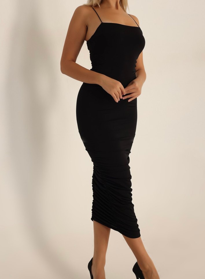 Kadınlar için ince askılı, tek renk siyah uzun elbise. Drapeli ve vücuda oturan kesimiyle romantik geceye uygun şık bir parça.