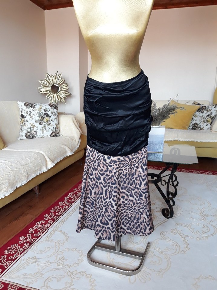 Kadınlar için siyah, drapeli uzun etek, bol kesim ve koyu zebra desenli, avant-garde parti stilleri için uygundur. Sentetik kumaştan üretilmiştir.