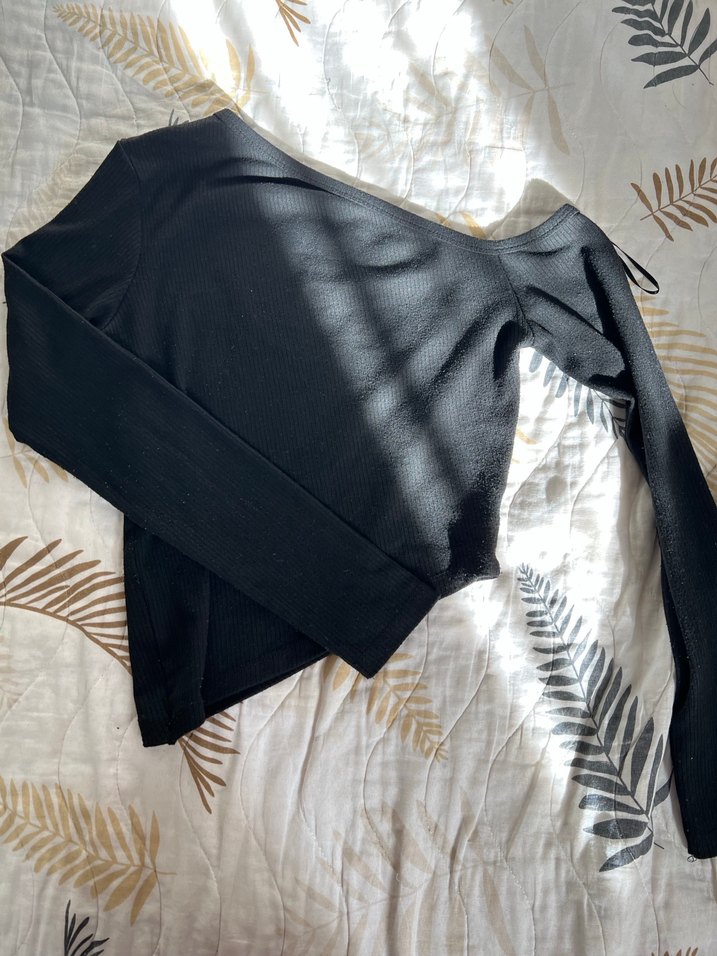 Siyah, drapeli ve uzun kollu, tek renk, tekne yaka, vücuda oturan kadın bluz. Yumuşak sentetik kumaştan, günlük rahat sokak stili için uygun.