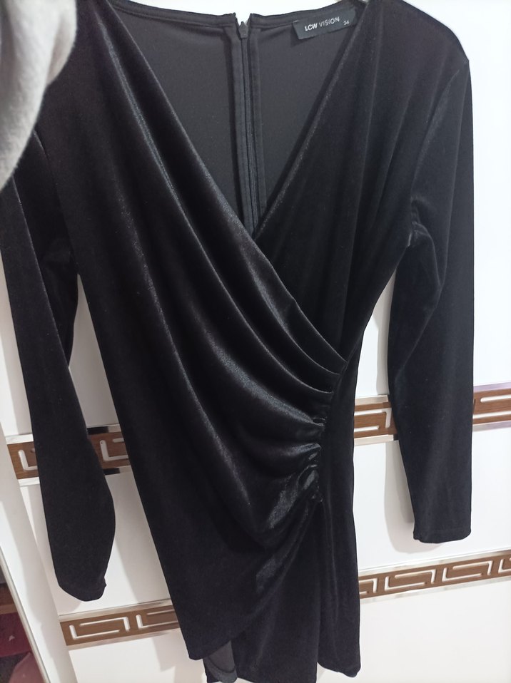 Siyah, drapeli, V yakalı, uzun kollu, midi uzunlukta, klasik şıklıkta gotik tarzda kadın elbisesi.