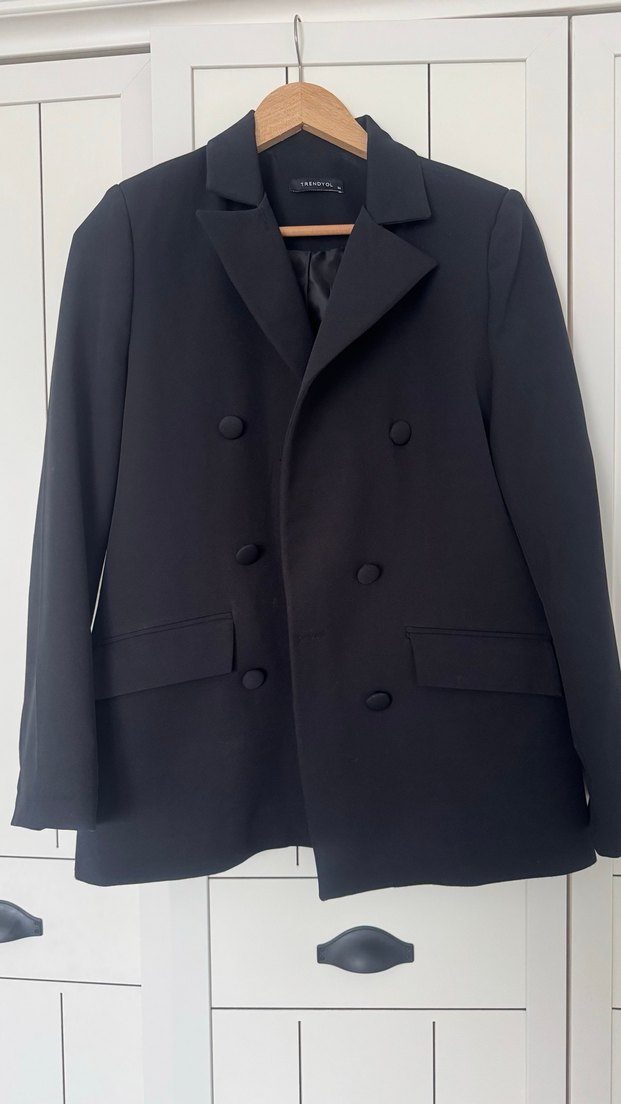 Düğmeli önü, kesimli yakası ve uzun kollu siyah blazer. Normal boy ve regular fit, sentetik kumaştan, ofis kullanımı için uygun.