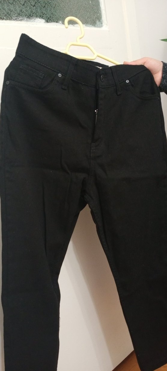 Siyah, bolkesim kadın pantolon, düğmeli ve sentetik kumaştan. Minimalist tarzıyla günlük kullanım için uygundur.