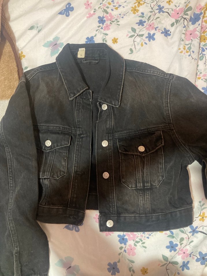 Siyah, düğmeli, uzun kollu, yakası kesik ve göğüs cepli, günlük sokak stiline uygun kadın fitted denim ceket.
