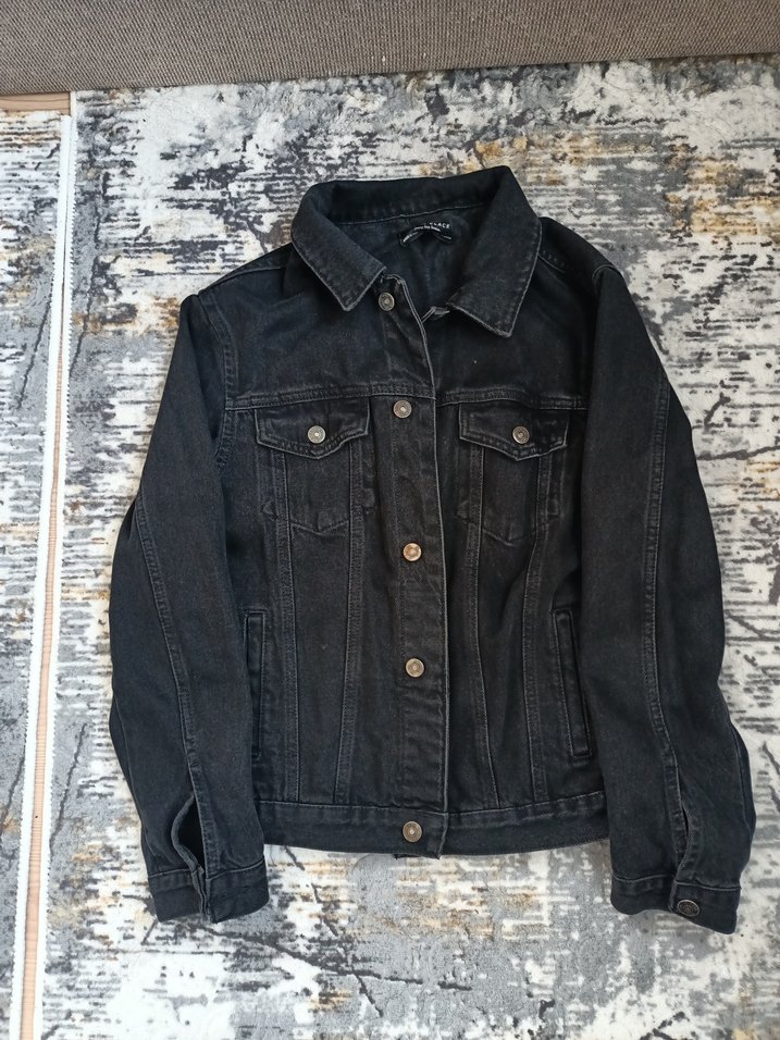 Bu siyah denim ceket, uzun kollu ve kesimli yaka ile regular fit sunar. Düğmeli ön kısmı ve normal boyu ile sokak stili ve günlük kullanım için uygundur.