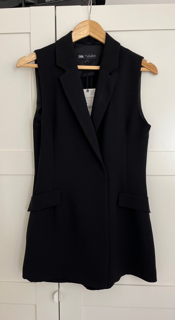 Düğmeli, siyah midi kruvaze yaka kolsuz ve keskin yaka detayıyla. Ofis ve sokak stiline uygun, düz kumaştan ve rahat kesim. Benim boyum 170, cok kısa geldi rahat edemedim. Dolayısıyla gordugunuz gibi etiketi üstünde. Hiç giyemedim♀️