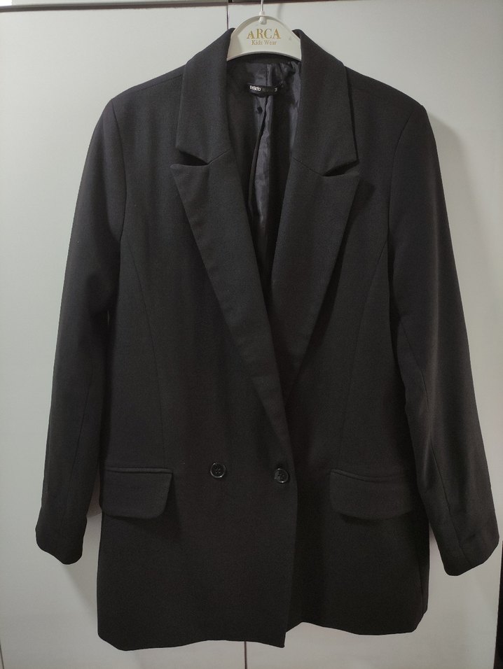 Düğmeli, siyah midi blazer. Notch yaka ve ince askılı kolları ile klasik, ofis ve günlük kullanıma uygun. Sentetik kumaştan üretilmiştir.