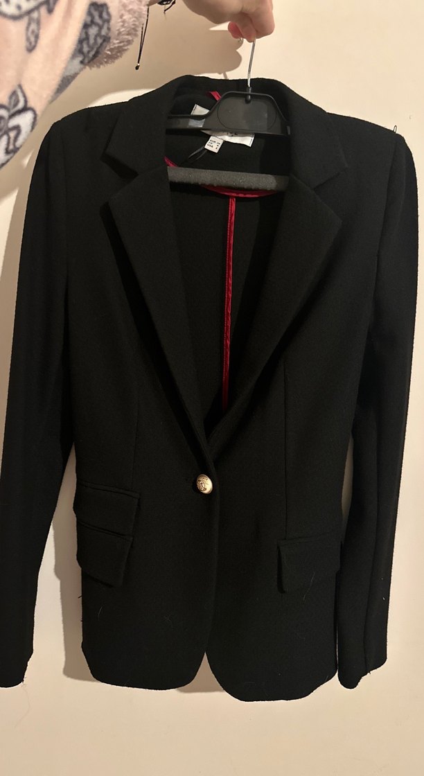 Kadın siyah blazer, kesik yaka ve düğmeli detaylara sahip. Uzun kollu, normal kesim ve midi boyda, sentetik kumaştan üretilmiştir. Ofis kullanımı için uygundur.