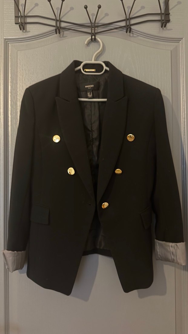 Kadın siyah blazer, kesimli yaka ve uzun kollu. Altın düğmeli, normal kesim ve ipeksi kumaş, ofis için uygun.