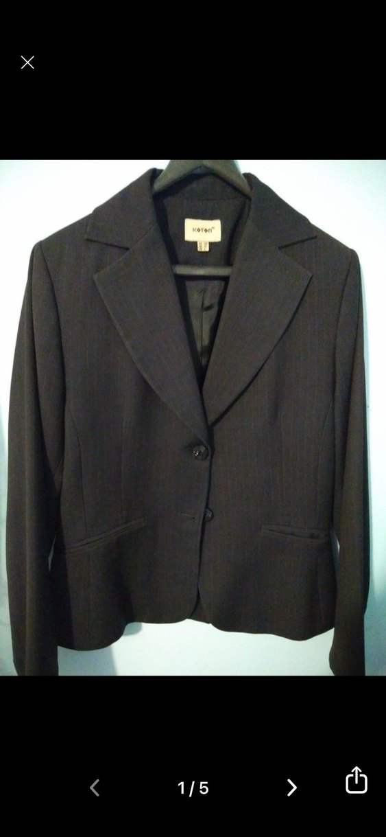 Kadın siyah blazer, kesik yaka ve düğmeli kapanışa sahip. Normal uzunlukta, uzun kollu ve satenimsi kumaştan üretilmiş, modern klasik tarzda ofis kullanımı için uygun.