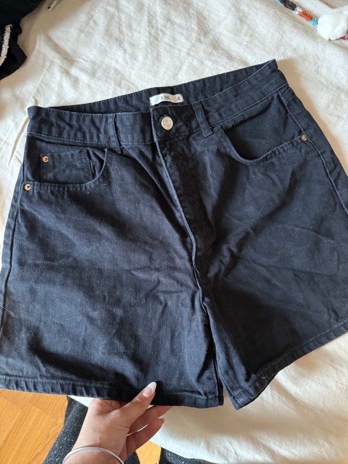 Siyah renkli, düğmeli, normal boy midi denim şort. Rahat kesimiyle gündelik kullanıma uygundur.