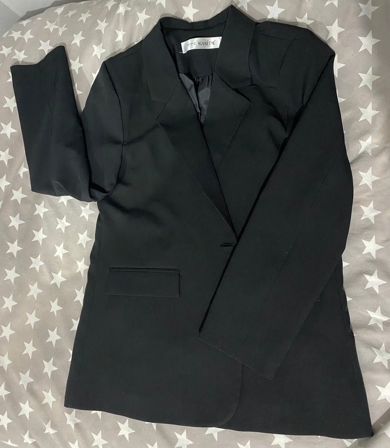 Bu siyah kadın blazeri, düğmeli ve içi satendir.Uzun kollu, normal kesim ve midi boydadır. Ofis için uygun, düz ve desensiz tasarımdadır.