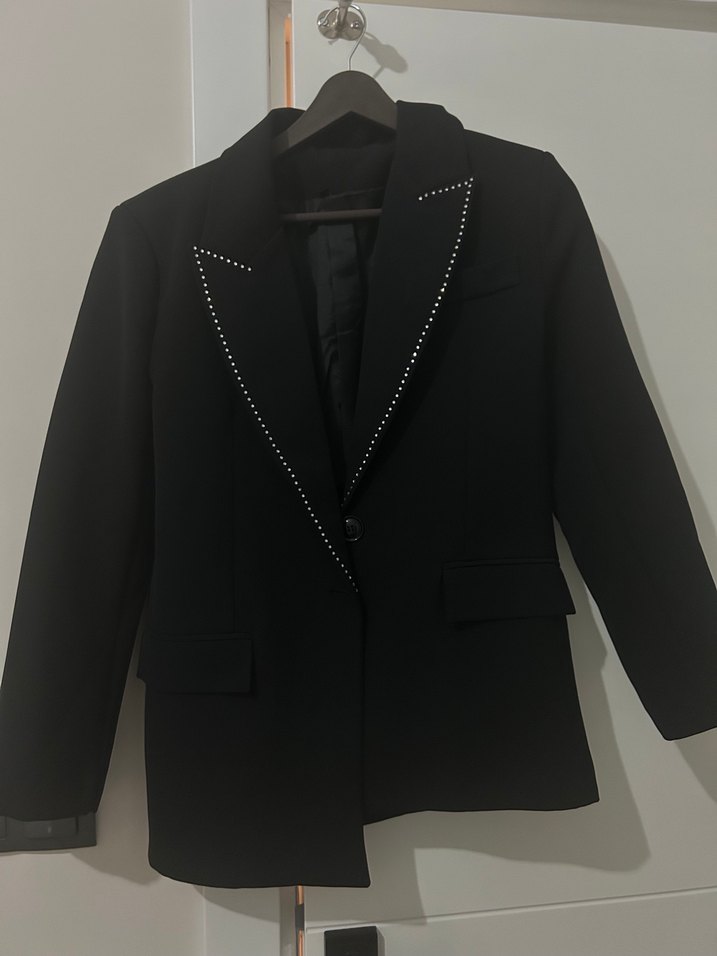 Kadın siyah blazer, düğmeli ve sivri yakalıdır. Sentetik kumaştan, normal boy ve regular fit kesimdedir. Askılı kollu, desensiz tasarımı ofis ve şık goth tarzına uygundur. Hiç giyilmedi