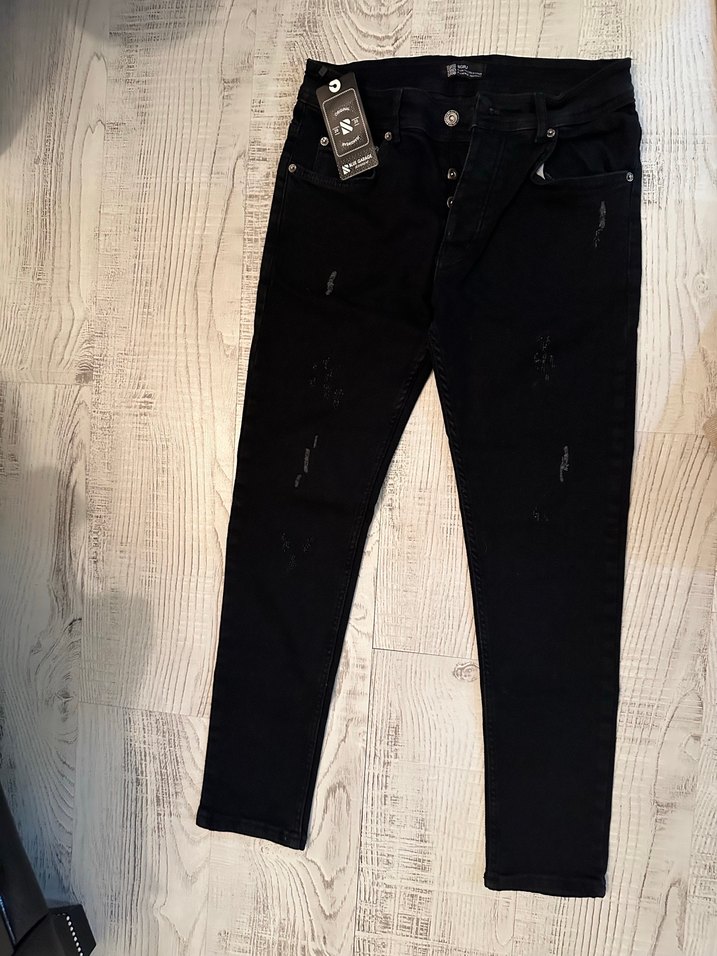 siyah denim kot pantolon, regular fit ve düğmeli. Uzun paçalı, desen içermeyen tasarımıyla günlük sokak stili için uygundur.