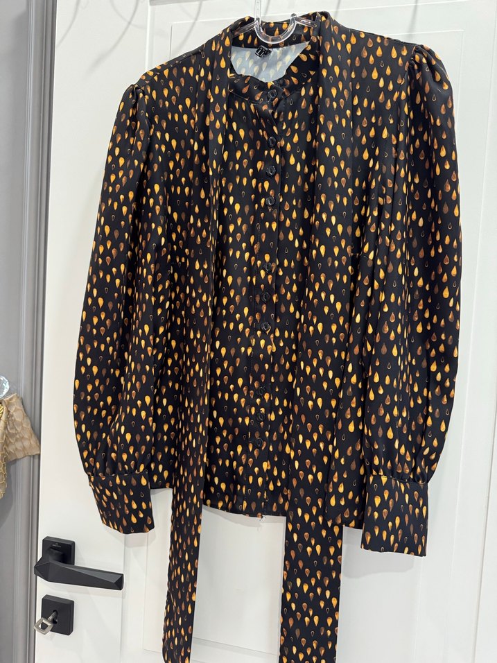 Kadın siyah gömlek, düğmeli uzun kollu, yakalı ve bol kesimdir. Midi boyda, koyu tie-dye desenli, sokak modası tarzında, sentetik dokulu kumaştan üretilmiştir. Ofis için uygundur.