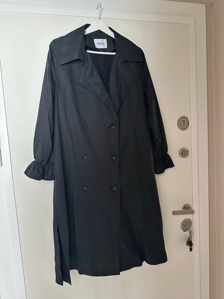 Siyah kadın trençkot, uzun boy, düğmeli ön ve keskin yakaya sahip. Uzun kollu, fırfırlı manşetli ve normal kesimdir. Sentetik kumaştan üretilmiş, desen yok.