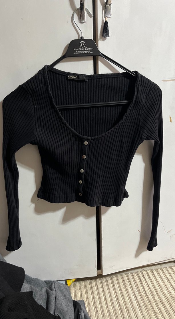 Bu siyah, düğmeli, V yakalı triko kazak, uzun kollu ve dar kesim olup günlük kullanıma uygun şık ve gündelik gotik tarz sunar.