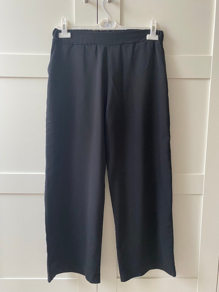 Kadın siyah midi uzunlukta, rahat kesim ve ipeksi kumaştan yapılmış kumaş pantolon. Minimalist normcore tarzı, ofis için uygun. ✨
