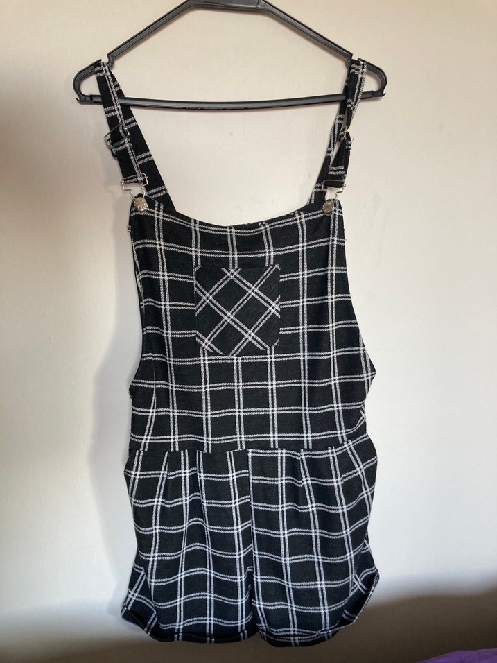 Herhangi bir defosu yoktur. Siyah ekose desenli, askılı ve tokalı kısa tulum, rahat ve bol kesimle sokak stiline uygun.