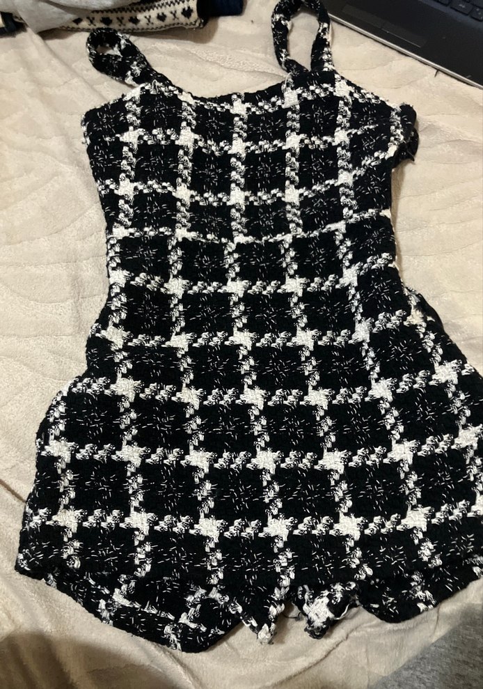 Siyah beyaz ekoseli örme kumaştan, askılı ve tekne yaka kısa kesim, dar kesim kadın tulumu. Günlük kullanıma uygun sokak stili. Fermuarı hasarlı yaptırıldığı taktirde hiç bir sorunu yok