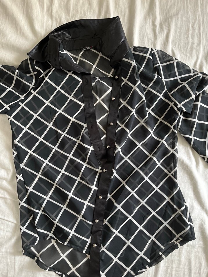 Siyah ekose desenli bu gömlek, yakalı, düğmeli ve askılı kollu. Regular kesim ve midi boyda, yumuşak sentetik kumaştan, şık ofis görünümü için uygundur. Sade kol düğmesinin biri yok ben kendim içten dikmiştim öyle kullanıyordum. 3. görselde mevcut