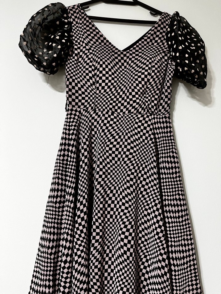 Bu siyah beyaz ekose desenli, V yakalı ve pileli etekli midi elbise, dar kesimi ve askılı kollarıyla dikkat çekiyor. Sentetik kumaştan, gotik ve Paris tarzı bir parti elbisesi.