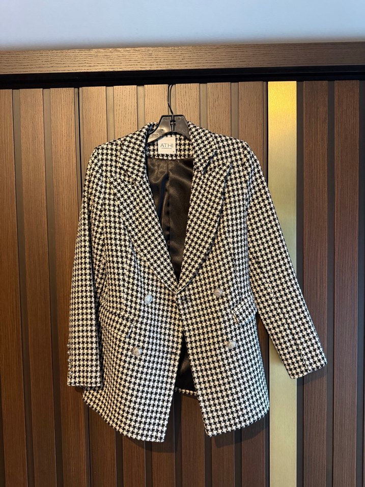 Kadınlar için siyah ekoseli, yakalı ve düğmeli midi blazer. Uzun kollu, normal kesim ve yumuşak kumaştan, ofis için uygun.