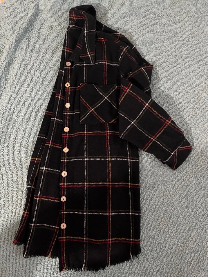 Kadınlar için siyah ekoseli uzun kollu, düğmeli, regular kalıp gömlek. L beden ama ben s giyen biri olarak oversize da kullanıyordum, güzel duruyor. Çok uzun yıllardır giymediğimi fark ettim, iyi durumda