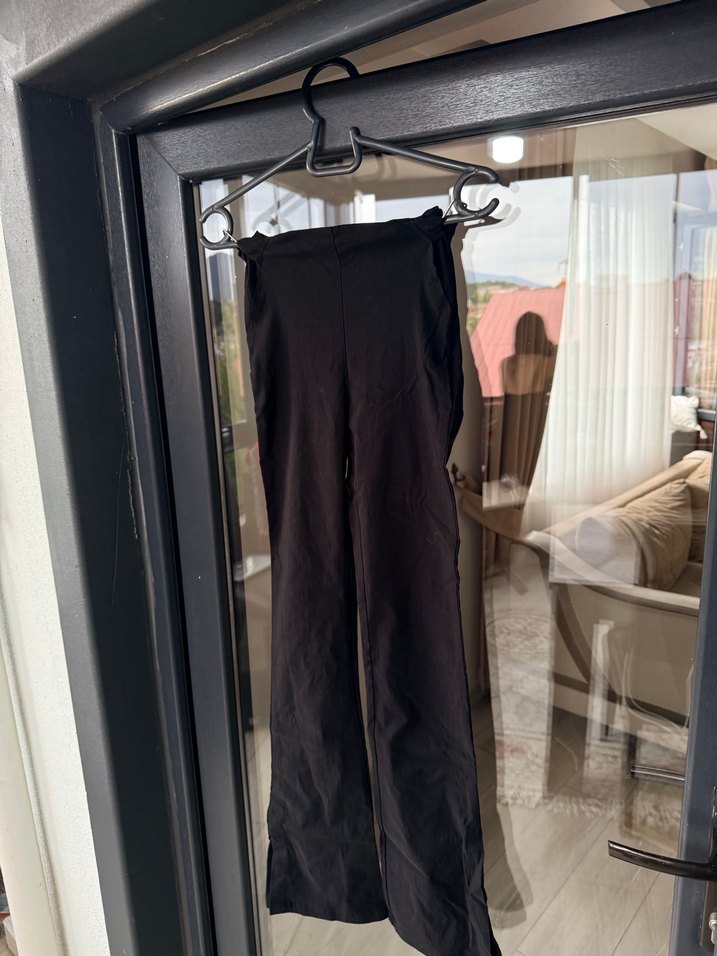 Siyah, kemerli, fitted kesim esnek kumaş pantolon, sokak stili ve günlük kullanım için uygun, yumuşak sentetik kumaştan.