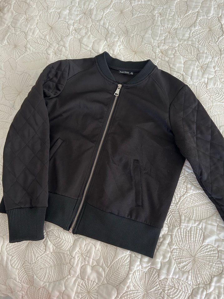 fermuarlı, düz siyah ceket. kolları baklava desenli kalın bir ceket Bershka