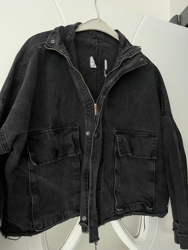 Bu siyah denim ceket, bol kesim ve notlu yaka detayına sahiptir. Uzun kollu, fermuarlı ve kapaklı ceplidir, günlük kullanım için uygundur.