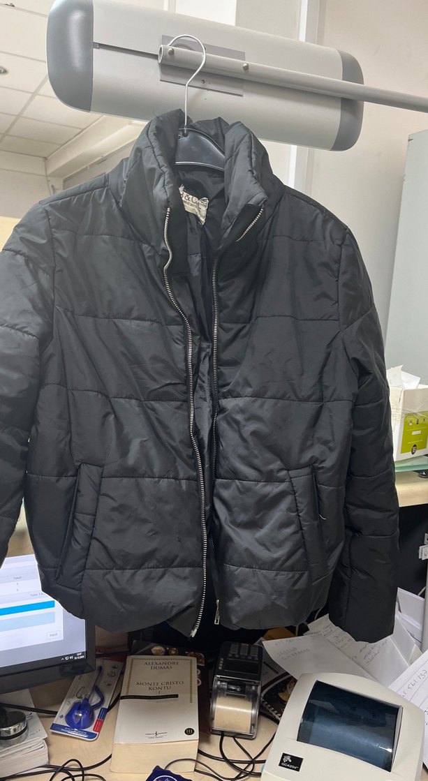 Kadın siyah mont, dik yakalı ve fermuarlı tasarıma sahip. Uzun kollu, normal boyda ve soft sıcak kumaştan, sokak stiline uygun.fotoğraftada belirttiğim gibi küçük bir ezilme var