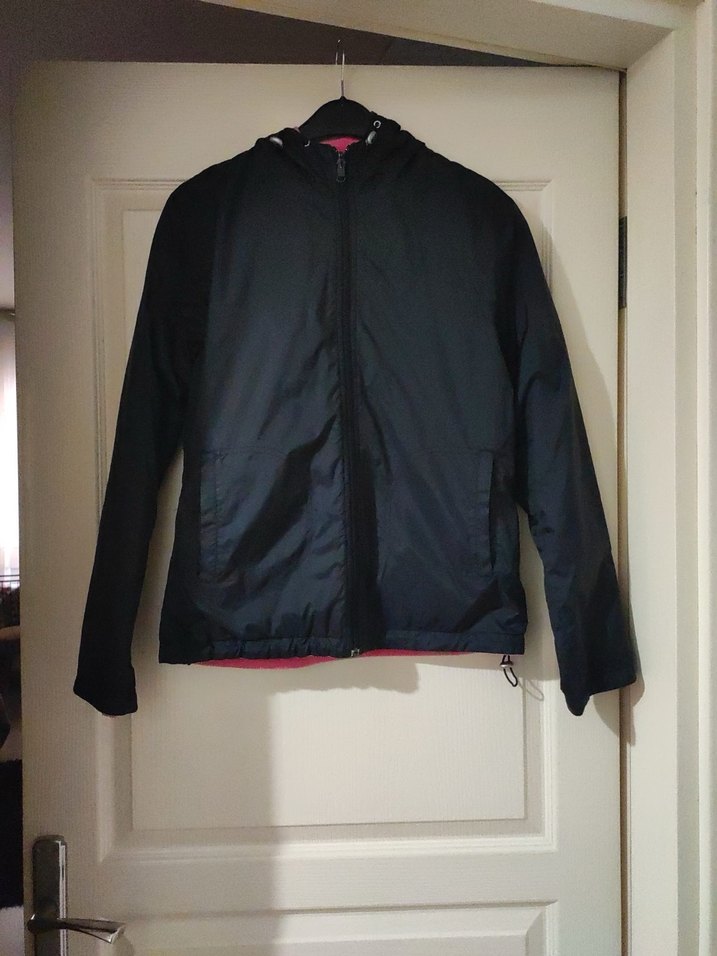 Kadınlar için siyah, fermuarlı, kapüşonlu yağmurluk. Yüksek yakalı, uzun kollu ve vücuda oturan kesime sahip, dış mekan kullanımı için uygun sentetik kumaştan yapılmıştır. Boyu omuzdan 63 cm, eni 49 cm. Kol boyu 62 cm. Kolun ağız kısmı 15 cm. Her iki taraflı kullanılıyor.
