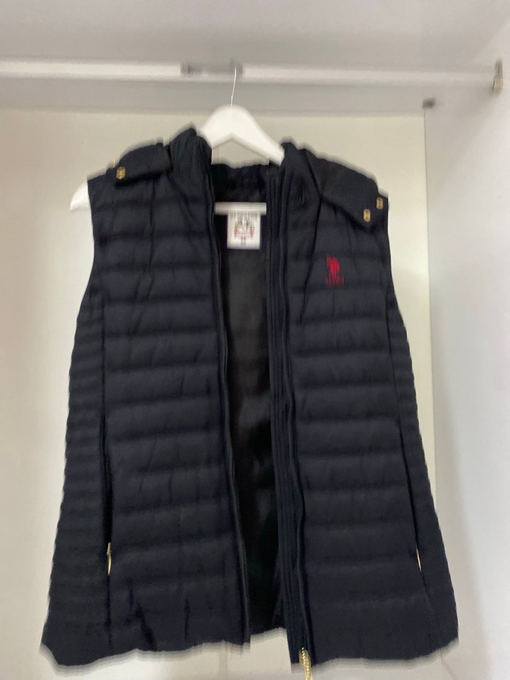 Kadın siyah, kapüşonlu, fermuarlı şişme yelektir. Yumuşak fleece kumaştan, yüksek yaka ve kolsuzdur. Casual tarzlara uygundur.