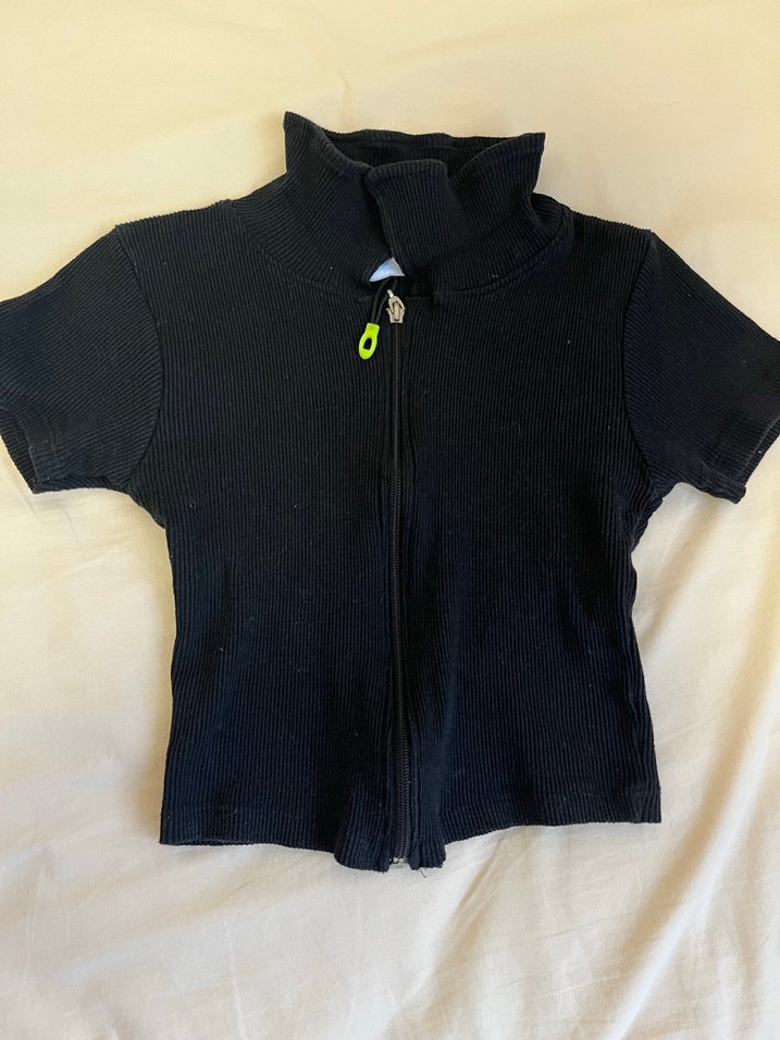 Kadın Siyah Fermuarlı Kısa Kollu Tişört Crop