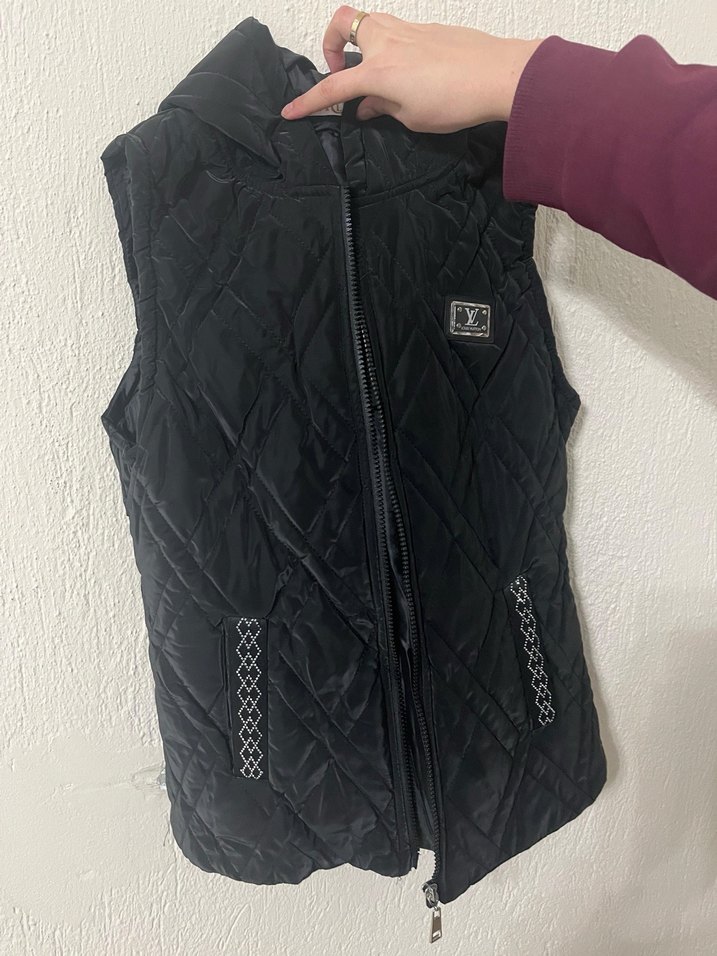 Siyah kolsuz yelek, yüksek yakalı ve fermuarlı ön kısmıyla, sentetik kumaştan ve vücuda oturan kesimlidir. Günlük kullanıma uygun sokak stili sunar etikette 38 yazıyor ama 36 bedene uygun kalıbı .