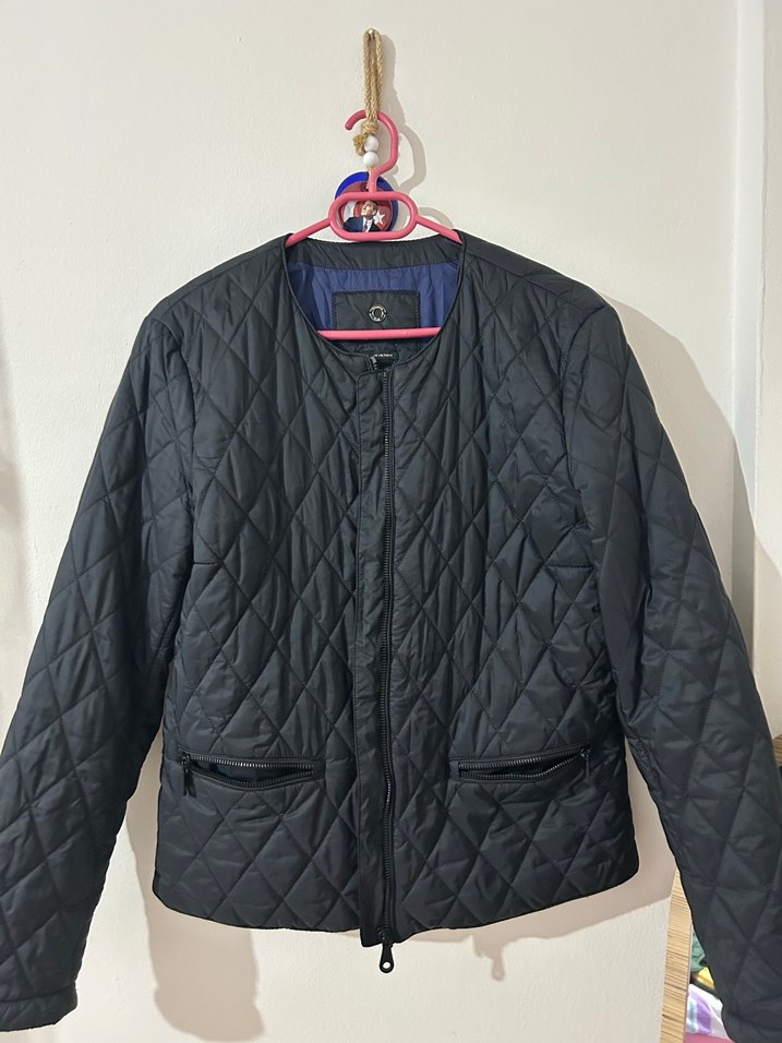 Siyah renkli, fermuarlı, uzun kollu kadın ceket. Normal kesim ve midi boyda, sentetik kumaştan, minimalist tarzda günlük kullanım için uygun.