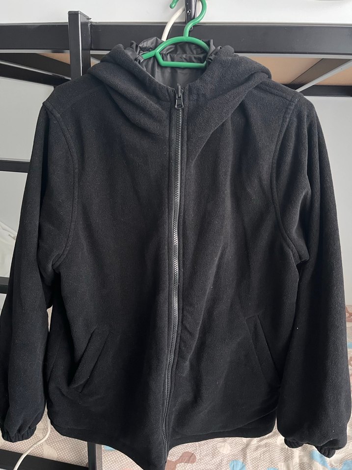 Kadın siyah fermuarlı ceket, yüksek yakalı ve yumuşak, sıcak kumaştan yapılmıştır. Rahat kalıp ve uzun kolludur, günlük sokak stili için uygundur. Yağmurluk olarak almıştım.