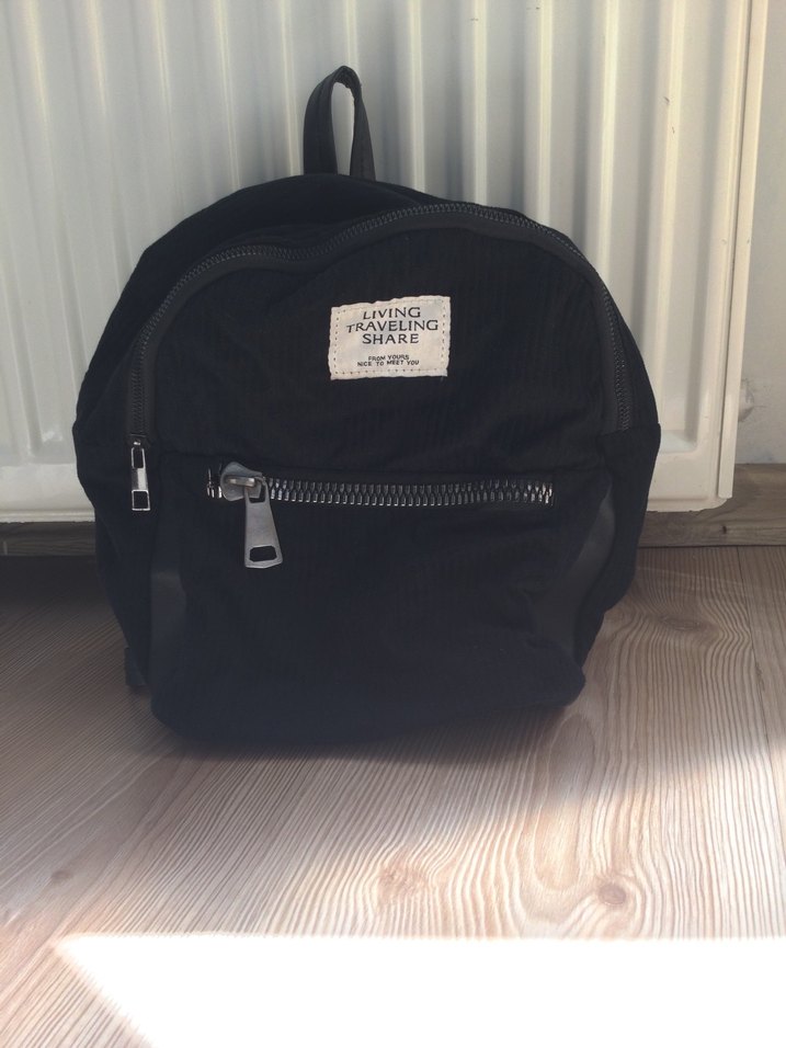 Fermuarlı tasarıma sahip siyah sırt çantası, yumuşak kumaş ve 'LIVING TRAVELING SHARE' yazılı baskılı etiketi içerir. Sokak stiline uygun sade görünümlü.
