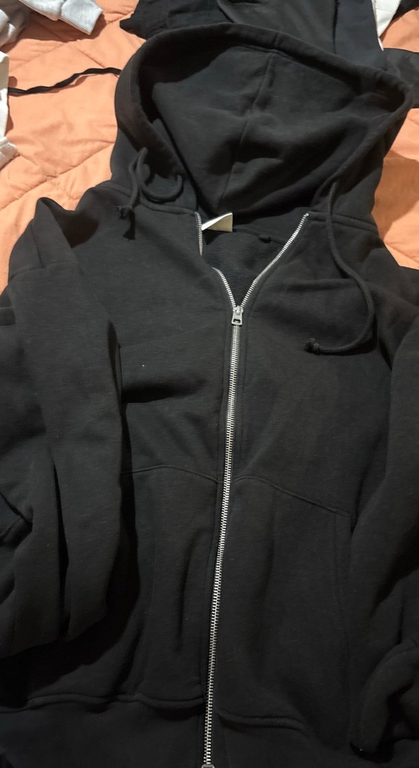 Kadın siyah fermuarlı sweatshirt, yüksek yakalı ve uzun kolludur. Yumuşak ve sıcak kumaştan, kapüşonlu ve normal boyda, sade tasarımlıdır.