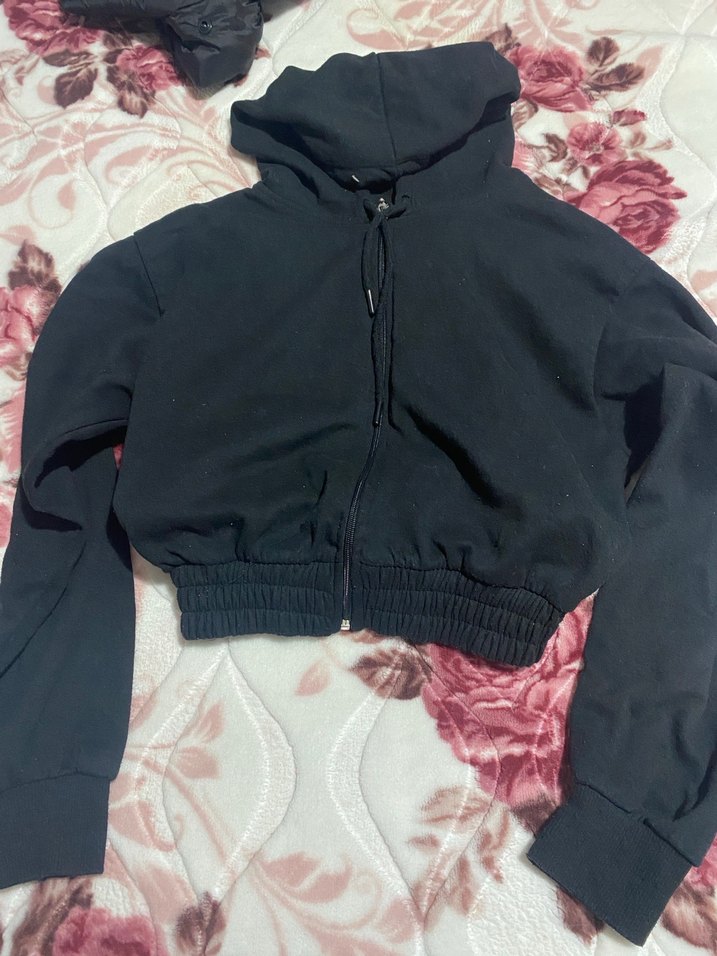 Dar kesim siyah sweatshirt, yüksek yakalı ve uzun kolludur. Fermuarlı ve elastik bel bantlıdır. Yumuşak, sıcak kumaştan yapılmıştır. Günlük kullanım için uygundur.