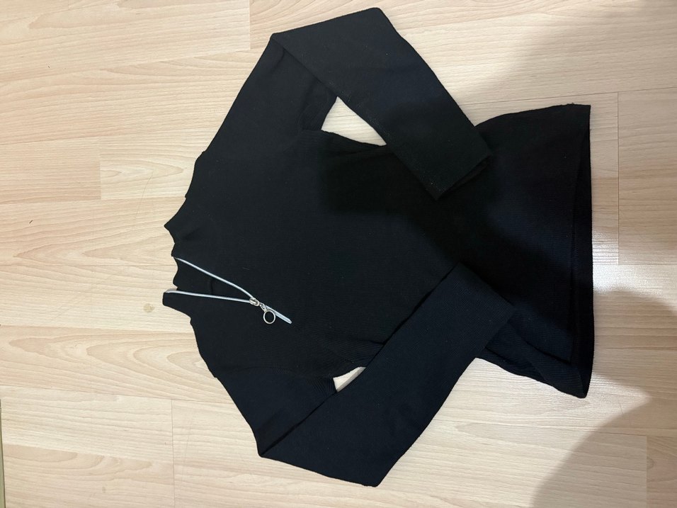 Kadınlar için siyah, yarım balıkçı yaka ve fermuarlı detaylı, ince kesim kazak. Uzun kollu, normal midi boyda, sentetik yumuşak kumaştan yapılmıştır.