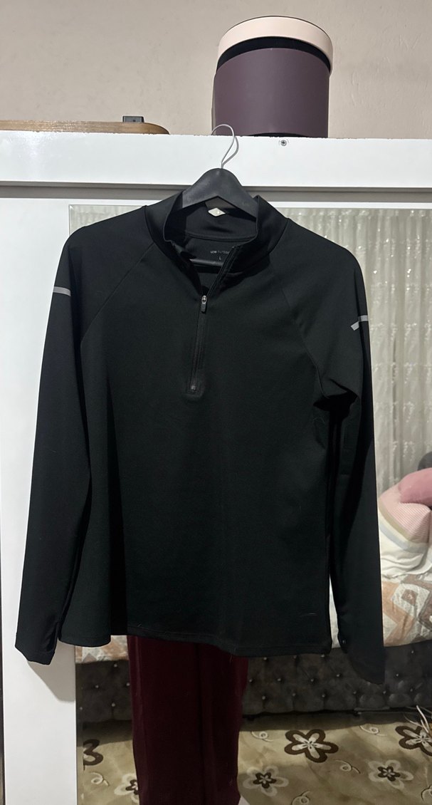 Kadın için siyah, yarım fermuarlı, uzun kollu ve yüksek yakalı fitted sweatshirt. Sentetik kumaştan, günlük kullanım için uygun şık bir sokak stili parçası.