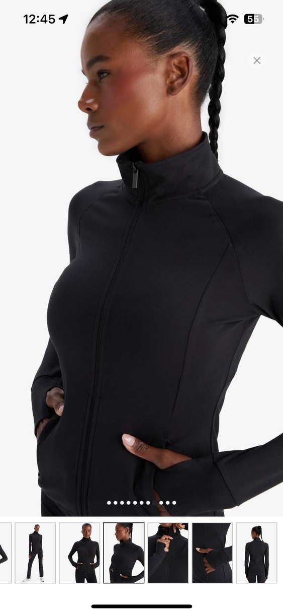 Siyah renkli, yüksek yakalı ve fermuarlı kadın spor üstü. Uzun kollu ve vücuda oturan kesimiyle spor ve günlük kullanıma uygundur. yeni ve etiketli ürün