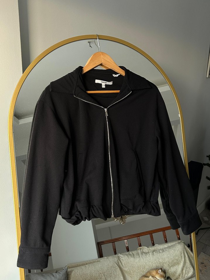 Kadın siyah ceket, yüksek yakalı ve uzun kolludur. Bol kesim, fermuarlı ön ve midi boydadır. Yumuşak, sıcak kumaştan yapılmıştır ve günlük kullanım için uygundur.