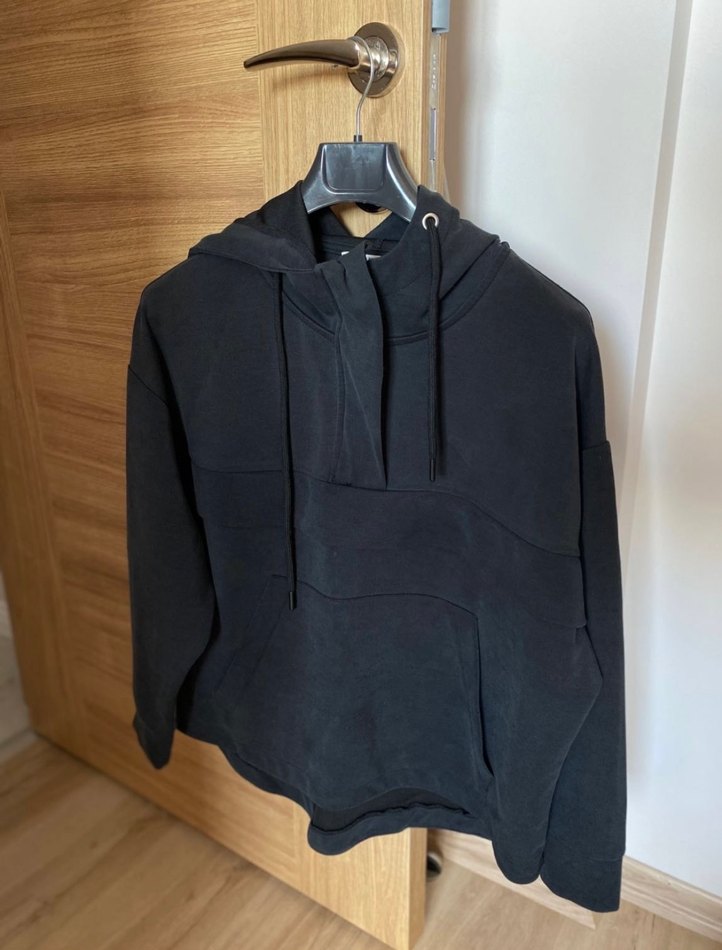 Kadın siyah sweatshirt, yüksek yakalı ve uzun kolludur. Fermuarlı ön kısmı ve yumuşak fleece kumaşıyla rahat ve bol kesimdir.